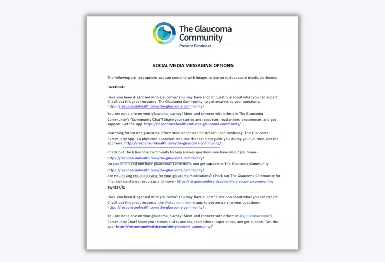 • Social Media posts and texts (for Facebook, LinkedIn, Instagram, and X): These social media images and text have been tailored for each social media platform. They can be posted to encourage your patients, clients, and community to learn more about The Glaucoma Community.