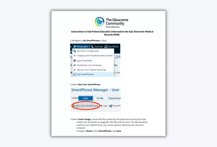 • Instructions and Patient Materials for Epic Electronic Medical Records (EMR): Use the instructions and the image to add information about The Glaucoma Community into your Epic EMR system in the After Visit Summary (AVS).